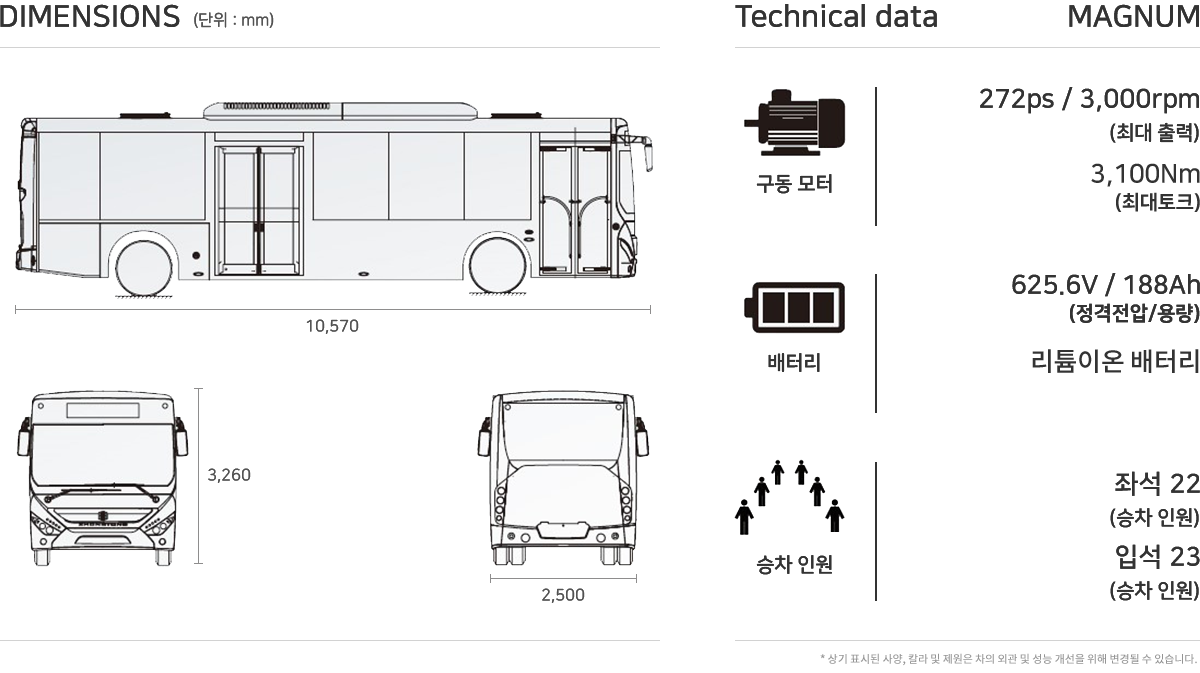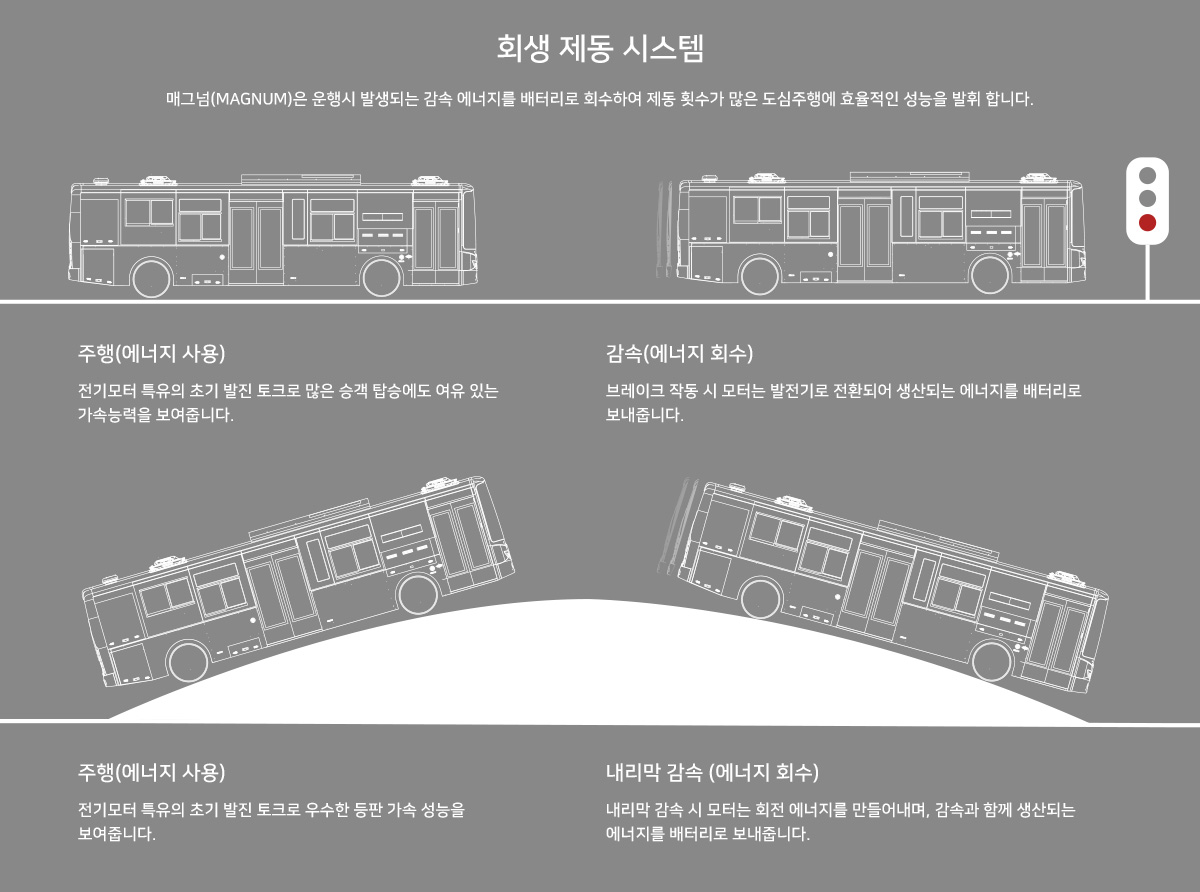 매그넘은 배출가스가 전혀 없는 전기를 연료 사용과 모터 직접 구동 방식 기술을 접목시켜 소음과 진동을 현저히 감소시켰습니다.